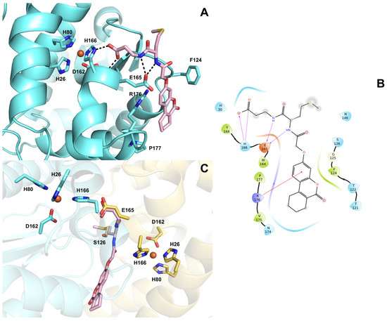 To provide an explanation at the molecular level for the inhibitory activity of ALS-31 towards SmSOD, a docking model is proposed, elucidating the putative interactions between this compound and the enzyme. ALS-31 is hosted in a cleft at the dimer interface, establishing two strong H-bonds with both ND1 and N of H166 through its acidic group (Figure 7A,B). Moreover, the ligand amide nitrogen atoms engage two further H-bonds with E165. The coumarin moiety forms an additional cation-π interaction with the side chain of R176. It is worth noting that H166 and E165 are critical hot spots involved in dimer assembly; in addition, H166 is also part of the metal coordination sphere in the active site. The docking pose shows that the ALS-31 acidic group is superimposable to E165 side chain on the other monomer, whereas the methyl(propyl)sulfane group nicely overlaps to S126 (Figure 7C). On the basis of this model, it can be hypothesized that compound ALS-31 is able to compromise the enzyme dimeric structure by mimicking these key hot spots residues required for monomer association and might eventually also result in a perturbation of the metal coordination, thus impeding the enzyme catalytic activity. Interestingly, this ‘glutamate bridge’ (that is, the glutamate residue on one monomer H-bonded to the metal ligand histidine of the other monomer) is highly conserved in Fe- and Mn–SODs, implying an important role in protein structure. Indeed, point mutation of this residue to alanine has been reported to destabilize the dimer structure, with the protein mutant occurring as a mixture of dimer and monomer species [56].
