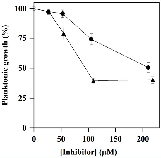 The antimicrobial activity towards S. mutans cultures by compounds ALS-31 and ALS-31-9 was assayed by broth microdilution method. As shown in Figure 8, the planktonic growth of S. mutans was inhibited by compound ALS-31 and ALS-31-9 in a dose-dependent way. In particular, the percentage of growth was reduced to 74.3 ± 4.5 or 50.7 ± 4.2 in the presence of 104 or 209 µM ALS-31, respectively. The analogue ALS-31-9 is more potent than ALS-31, because the percentage of planktonic growth of S. mutans was reduced to 79.0 ± 4.6 or 39.5 ± 2.1 in the presence of lower ALS-31-9 doses, i.e., 54 or 108 µM, respectively; no further reduction in growth was observed when the concentration of this analogue was 216 µM. These data suggest that ALS-31 and ALS-31-9 do not display an antimicrobial activity in S. mutans suspensions up to the respective concentrations of 50 µM or 25 µM.