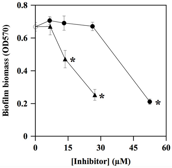 During its colonization of the dental surface, S. mutans is capable of forming thin biofilms on teeth, thus giving rise to dental plaque and caries. For this reason, the antibiofilm activity of ALS-31 and ALS-31-9 in S. mutans cultures was investigated using the CV staining method. However, in order to exclude effects due to inhibition of the planktonic growth, the maximum inhibitor concentration chosen in this assay is 52.5 µM for ALS-31 and 27.3 µM for ALS-31-9. As shown in Figure 9, both substances are capable of inhibiting the total biofilm biomass formation in S. mutans cultures, although with a different potency. Indeed, when ALS-31 is present at 52.5 µM, the formation of the biofilm is greatly reduced, accounting for 68.2% inhibition; no effects are observed with serial dilutions from this ALS-31 concentration. On the other hand, the analogue ALS-31-9 displays greater inhibition potency, as emerging from the values of 62.1% or 29.4% measured at 27.3 µM or 13.5 µM, respectively. Therefore, ALS-31 and, even more, ALS-31-9 could be considered as promising compounds for the design of molecules capable of inhibiting the formation of the thin biofilm on teeth during the colonization of the oral cavity by S. mutans.