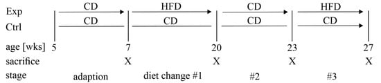 Experimental setup of the animal experiment. Male C57BL/6J mice were divided into the experimental (Exp) and control (Ctrl) groups at the age of 7 weeks after 2 weeks of adaption to our animal housing. Control animals were fed a control diet (CD, ca. 3514 kcal/kg, 10% of energy from fat, 66% from carbohydrates, and 24% from protein) throughout the study period. The experimental group was fed a high-fat diet (HFD, ca. 5389 kcal/kg, 70% of energy from fat, 14% from carbohydrates, and 16% from protein) from 7 to 20 weeks of age, followed by rescue feeding with the CD for 3 weeks, and another cycle of the HFD for 4 weeks. Euthanasia was carried out in both groups at 7, 20, 23, and 27 weeks of age.