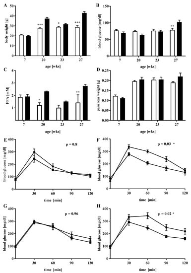 Fasting and dynamic blood glucose levels, body weight, free fatty acid levels, and pancreas weight of the research animals. IPGTT and euthanasia was conducted before dietary changes and at the end of the experimental procedure at 7, 20, 23, and 27 weeks of age. Fasting blood glucose levels and body weight were monitored every two weeks until 20 weeks of age, and then weekly. (A) Body weight and (B) fasting blood glucose values at 7, 20, 23, and 27 weeks of age; n = 5–33 mice/timepoint/group. (C) Blood FFA levels as determined by ELISA; n = three mice/timepoint/group. (D) Pancreas weight; n = six mice/timepoint/group. (E–H) IPGTT results at (E) 7, (F) 20, (G) 23, and (H) 27 weeks of age; n = five mice/timepoint/group. For each graph, the white bars represent the controls, and the black bars represent the experimental group. *** denotes p < 0.001, ** p < 0.005, and * p < 0.05 ((A–D): two-way ANOVA, (E–H): unpaired t-test).