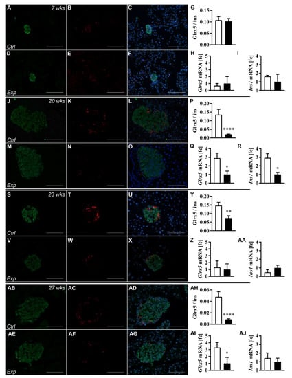 Immunohistological and Ins1 and Glrx5 mRNA expression analysis. The immunohistological staining patterns of insulin and Glrx5 were analyzed at 7, 20, 23, and 27 weeks of age. Glrx5 staining was quantified by calculating the ratio of the Glrx5/insulin staining area. The mRNA expression of Ins1 and Glrx5 was studied using qRT-PCR. (A–F, J–O, S–X, AB–AG) Representative images taken from the immunohistological analysis of insulin and Glrx5 presenting size-matched representative islets of both groups of mice ((A–C) controls, 7 weeks; (D–F) HFD, 7 weeks; (J–L) controls, 20 weeks; (M–O) HFD, 20 weeks; (S–U) controls, 23 weeks; (V–X) HFD, 23 weeks; (AB–AD) controls, 27 weeks; (AE–AG) HFD, 27 weeks). Green = insulin, red = Glrx5, blue = nuclei. Scale bars represent 100 µm. Images were taken at 200× magnification. n = 33–67 islets of three to four mice/timepoint/group. (G,P,Y,AH) The quantification of Glrx5 staining. (H,Q,Z,AI) The islet mRNA expression of Glrx5 and (I,R,AA,AJ) of Ins1 given as fold change controls vs. HFD for each time point. n = six mice/timepoint/group. For each graph, the white bars represent the controls, and the black bars represent the experimental group. **** denotes p < 0.0001, ** p < 0.005, and * p < 0.05 (two-way ANOVA).