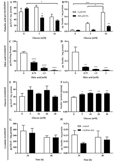 To model the observed fluctuation of blood FFA levels in vitro, we pre-incubated MIN6 cells with 400 µM palmitate for 48 h followed by 1 h of starvation and consecutive exposure to glucose (3 and 16 mM) for 24 h. Although the Glrx5 protein level was not significantly affected by exposure to glucose alone, pre-treated cell glucose dependently featured a significantly mitigated level of Glrx5 (82.8 ± 9.5 vs. 46.3 ± 11.8 pg/mg, * p < 0.05 at 3 mM glucose, Figure 5A). The amount of insulin in the medium was significantly lower in pre-treated cells, indicating a correlation between insulin secretion and Glrx5 (0.56 ± 0.14 vs. 0.14 ± 0.03 µg/mg, ** p < 0.005 at 16 mM glucose, Figure 5B). The exposure to oleic acid alone led to similar results. In a dose-dependent manner, the amount of Glrx5 (91.32 ± 13.11 vs. 43.03 ± 10.91 vs. 20.82 ± 7.56 vs. 8.76 ± 0.85 pg/mg, **** p < 0.0001, Figure 5C) as well as the amount of insulin in the medium (0.38 ± 0.2 vs. 0.08 ± 0.01 vs. 0.03 ± 0.01 vs. 0.02 ± 0.002 µg/mg, ** p < 0.005 at 0.75 mM, *** p < 0.001 at 1.5 and 3 mM, Figure 5D) decreased. Similar results were observed for palmitic acid (data not shown). To separate the effects of FFA and hyperglycemia on Glrx5 in β-cells, incubation with glucose in varying concentrations for 24 h was conducted after 2 h of starvation. No significant impact on Glrx5 was detected (41.17 ± 13.93 vs. 58.63 ± 14.24 vs. 48.44 ± 2.43 vs. 58.05 ± 19.05 vs. 40.11 ± 3.85 pg/mg, n.s., Figure 5E), whereas insulin in the culture medium increased (0.074 ± 0.002 vs. 0.089 ± 0.001 vs. 0.094 ± 0.004 vs. 0.091 ± 0.003 vs. 0.093 ± 0.005 µg/mg, * p < 0.05 at 5 mM glucose, *** p < 0.001 at 10 mM glucose, ** p < 0.005 at 20 and 30 mM glucose, Figure 5F). Since inflammation is an important factor in the diabetic metabolism, we also studied the effect of inflammatory cytokines. Cells were exposed to a cytokine mix consisting of 10 ng/mL TNF-α, 5 ng/mL IL-1β, and 100 ng/mL IFN-γ [30] for 24 and 48 h, respectively. As displayed in Figure 5G, no significant change in Glrx5 was observed upon treatment (385.1 ± 190.6 vs. 352 ± 154.9 pg/mg after 24 h, 275.1 ± 57.64 vs. 268.4 ± 84.34 pg/mg after 48 h, n.s.). The insulin in the culture medium declined non-significantly (0.16 ± 0.07 vs. 0.08 ± 0.02 µg/mg at 24 h; 0.14 ± 0.1 vs. 0.11 ± 0.05 µg/mg at 48 h, n.s., Figure 5H).