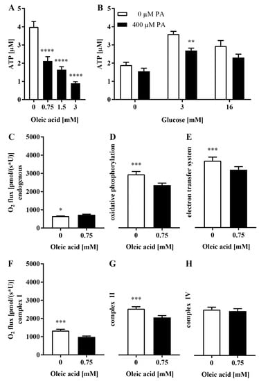 ATP production and the O2 flux in the respiratory chain after FFA treatment. Cellular ATP levels were analyzed employing a luciferase-based bioluminescence assay. Respiratory states were measured with an Oxygraph and an O2 probe. (A) ATP after exposure to oleic acid for 24 h or (B) after pre-incubation with 400 µM palmitate, 1 h of starvation, and exposure to glucose. (C–H) The O2 flux in the respiratory chain after exposure to 0.75 mM oleic acid for 24 h. The white bars represent the controls, and the black bars represent the (pre-)treated cells. n = 12. **** denotes p < 0.0001, *** p < 0.001, ** p < 0.005 and * p < 0.05 (one-way ANOVA/unpaired t-test).
