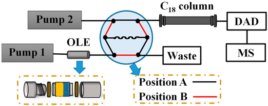 The OLE–DPPH–HPLC−DAD−QTOF-MS system was assembled in our laboratory, which included a Shimadzu LC-20AT high pressure constant flow pump (pump 1, Shimadzu Corporation, Kyoto, Japan), a homemade guard column (10 mm length × 4.6 mm i.d.), and an Agilent 1200 liquid chromatography system with a vacuum degasser, quaternary pump (pump 2), manual sampler, DAD (Agilent Technologies, Santa Clara, CA, USA) to assemble (Figure 1). The core part of this technology was the OLE–DPPH system. The guard column was first packed with silica gel (20 mg, 200–300 mesh, Qingdao Haiyang Chemical Co., Ltd., Qingdao, China), followed by ground CAVA (1.0 mg), and then filled with silica gel. After that, the guard column was positioned between pump 1 and the six-way value.