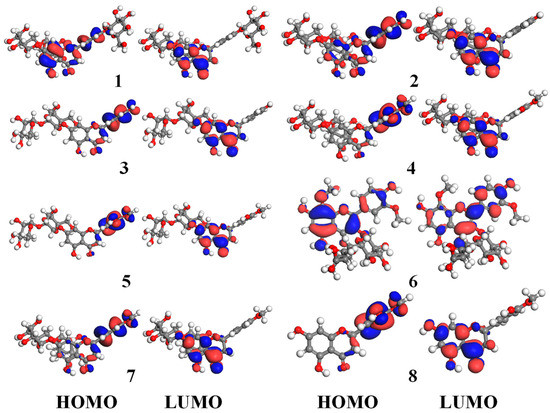 The Frontier Molecular Orbital theory is always selected to quantitatively predict the electron transport ability and chemical reactivity of molecules. The Highest Occupied Molecular Orbital (HOMO) and the Lowest Unoccupied Molecular Orbital (LUMO) are two key molecular orbitals for elucidation of chemical reactivity and the action. The HOMO contains the valence electrons and presents the highest energy, which can donate the electrons easily. On the contrary, the LUMO has the electron-deficient capability, which tends to accept electrons. The interaction between HOMO and LUMO was the main factor to form a transition state. Thus, HOMO and LUMO energies, and HOMO–LOMO energy gap (Eg) can provide important information for elucidation of chemical reactivity of compounds. It was reported that molecules with higher HOMO energy levels and lower Eg will transfer electrons easily and exhibited higher antioxidant activities [22]. Here, DFT calculations by Gauss 9.0 package were investigated, and Table 3 shows the calculated HOMO, LOMO, and Eg of eight flavonoids, while Figure 4 presents the HOMO and LUMO of them. As showcased in Figure 4, the electron cloud is essentially concentrated on the B-ring of flavonoids on the HOMO level, which indicates that the B-ring tends to donate electrons. However, the electron cloud focuses on the A and C-rings on the LUMO level, which shows that this region is susceptible to accepting electrons. Among flavanones (1–5, 7, and 8), aglycone 8 exhibited the higher highest HOMO energy (−6.123 eV) and the lowest Eg (4.292 eV) compared to glycosides (1–5 and 7) with HOMO energies from −6.545 to −6.128 eV and Eg ranges from 4.441 to 4.779 eV, respectively (Table 3). The results implied that flavanone aglycone might contain better electron transport ability and better antioxidant activity than flavanone glycoside. As observed for 2–5, and 7, variations in HOMO energies and Eg presented good correlations with their antioxidant activities.