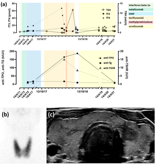 (a) Temporal evolution of thyroid function tests and thyroid autoantibody titers in the patient with GD. Treatments were as follows: beta-1a interferon, 44 mcg 3/week (22.06.2011–24.10.2011. We recommend writing in this format, 22 June 2011.); natalizumab, 300 mg 1/month (04.11.2011–06.02.2014); DMF, 240 mg 2/day (11.03.2014–12.10.2017); teriflunomid, 14 mg/day (28.10.2017–20.07.2018); methylprednisone, 1 g/day (02.05.2018–06.05.2018); and ocrelizumab, 300 mg/6 months (since 28.08.2018); (b) technetium-99m thyroid scintigraphy showing diffusely increased uptake by the thyroid gland (as compared to very low uptake in the salivary glands); and (c) composite ultrasound image of the thyroid gland showing diffuse heterogeneity with alternative isoechoic and hypoechoic areas.