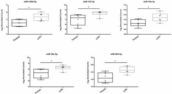 | DE miRNAs | Ttest | SAM | Fold Change Treated vs. Ctrl |