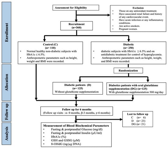 We recruited known diabetic subjects (n = 250) who were already on anti-diabetic regimen and study physician randomly categorized them into two groups based on coin-toss method: 125 diabetic patients were advised to continue with their anti-diabetic regimen (Group D), and the other 125 diabetic patients were given oral 500 mg glutathione (Jarrow Formulas, Los Angeles, CA, USA) supplementation once daily in addition to their anti-diabetic treatment (Table S2A,B) for a period of six months (Group DG) (Figure 1). At the time of randomization, concentrations of covariates, fasting and postprandial (PP) glucose and insulin, HbA1c, GSH and oxidized glutathione (GSSG), and 8-OHdG were not available, and therefore did not influence the assignment of diabetic patients in D or DG groups. Compliance to medical treatment by patients of D and DG group and consumption of GSH by patients of the DG was emphasized by maintaining continuous communication between the physician and patients. Out of 125 diabetic patients in D and DG group, 23 were lost to follow-up in the D group and 21 in DG group for not complying with the treatment regimen. We also recruited healthy non-diabetic control subjects who were followed for six months, during which they were advised to continue with their regular diet and exercise regimen. Blood samples were collected at the time of enrollment 0 (α visit), 3 (β visit), and 6 (γ visit) months after the date of enrollment.