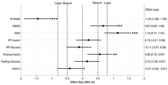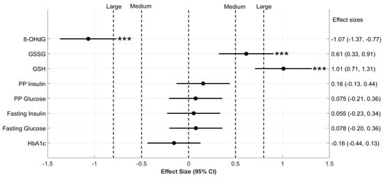 The effect size of changes in blood biochemical parameters. Six-month changes in the biochemical parameters of D and DG groups were compared here on a forest plot with effect size and corresponding 95% confidence intervals (CI). Effect size (Cohen’s d) calculated between 6-month changes in the concentration of biochemical variables are denoted on the x-axis. The group-wise means of 6-month changes in the concentration of these variables were compared using two-sample permutation tests. The significance of these comparisons is denoted by the p values mentioned to the right of horizontal lines for CI. Significance level is *** p < 0.001 for respective comparisons. Effect size takes either a positive or negative sign based on the direction of change: a positive effect size increases towards the right and a negative effect towards the left. Vertical dotted lines represent different classifications of effect size. In particular, “Medium” effects are labeled at 0.5 and −0.5, and “Large” effects at 0.8 and −0.8. Abbreviations used here are, HbA1c—glycated hemoglobin, GSH—reduced glutathione, PP glucose—postprandial glucose, PP insulin—postprandial insulin, and 8-OHdG—8-hydroxy-2-deoxy guanosine.