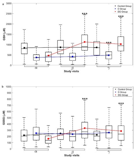 Longitudinal changes in the concentration of (a) GSH and (b) GSSG in different groups. The measured data for (a) GSH and (b) GSSG concentrations from Control, D, and DG groups at α, β, and γ visits are shown here with box and whiskers plots. Mean (black circles for Control, blue for D, and red for DG groups, respectively) and inter-quartile ranges (IQR) of the data are overlaid over the corresponding box plots. The group-wise means at different visits are connected using solid lines with the same color. Significance levels displayed above β, and γ visits denote the comparisons with α visit using permutation tests. Significance level is *** p < 0.001 for respective comparisons. Abbreviations used here are, GSH—reduced glutathione, and GSSG—oxidized glutathione.