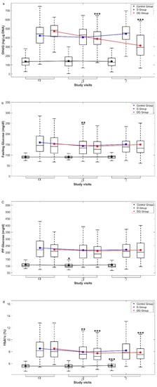 Biochemical parameters of subjects in Control, D, and DG groups at the first visit were represented using the descriptive statistics (Median, 25th percentile, and 75th percentile). All intra- and inter-group comparisons of biochemical parameters at different visits were performed using permutation tests, using the “Coin” package in R []. Statistical significance was set at p-value < 0.05. The results of permutation tests were confirmed with two-sample, two-sided t-tests. The results obtained from permutation tests were presented here. Effect size analysis was used to quantify the difference between 6-month biochemical changes in D and DG groups. All calculations and parametric t-tests were carried out using Matlab version 2019.