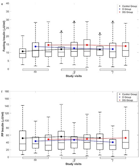 Interestingly, FPI levels also increased significantly in the DG sub-group from the α to γ visit compared to D (Cohen’s d = 0.56, p < 0.05). GSH supplementation had a small effect on levels of FPG, PPG, and PPI in the DG sub-group (Cohen’s d < 0.2, p < 0.05, all parameters).