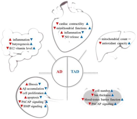AD is a complex systemic disorder, which induces the degenerative process in organs distant from the brain: cardiovascular system, gut microbiome, liver, testes, and kidney are involved (red arrows). Therefore, increased physical activity has been reported to have a preventive effect on all organs in AD (blue arrows). Aβ—β-amyloid; AD—Alzheimer’s disease; bm—basement membrane; BMP—bone morphogenetic protein; NO—nitric oxide, PACAP—pituitary--cyclase-activating polypeptide; TAD—trained AD.