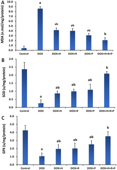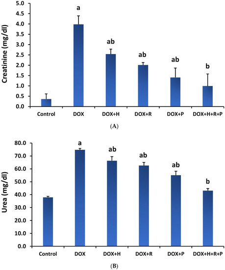 The findings in Figure 1A,B show that serum creatinine and urea levels in the DOX group were significantly higher (p ≤ 0.05) than in the control group. However, compared to the DOX group, treatment of H, R, or P alone or a mixture of H, R, and P led to a substantial reduction (p ≤ 0.05) in the serum urea and creatinine levels.