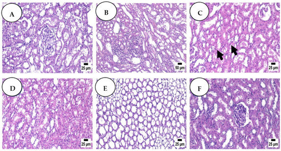 Dissected renal tissue samples were rinsed in normal saline and fixed in 10% saline for 72 h. After that, the specimens were cut and dried in alcohol, then cleared in xylene, filtered in wax, and finally blocked out into Paraplast tissue embedding media. A rotatory microtome was used to cut 5 µm thick sections of each sample. According to the previously reported methodology, the sections were stained with hematoxylin and eosin (H&E) stain [36]. Slides were examined under a microscope at 400× magnification.