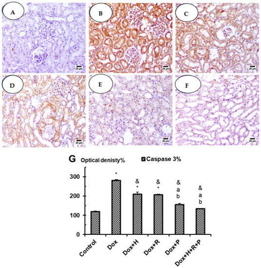 In the control group, the kidneys showed negative reactivity (0) for caspase-3 in glomeruli, negative cytoplasmic reactivity (0) in proximal tubules, and negative reactivity (0) in collecting tubules (Figure 5A); however, in the DOX Group, the kidneys showed an average renal capsule, atrophied glomeruli with widened Bowman’s spaces, proximal tubules with apoptotic epithelial lining with high expression of caspase 3% when compared with the control group at p ≤ 0.05 (Figure 5G), partial loss of brush borders and intra-tubular debris, and markedly dilated congested interstitial blood vessels with areas of hemorrhage. The renal medulla showed collecting tubules with apoptotic epithelial lining and congested peri-tubular capillaries (Figure 5B). In particular Dox + H and Dox + R groups, the kidneys showed moderate cytoplasmic reactivity (++) for caspase-3 in glomeruli, moderate (++) in proximal tubules, and moderate reactivity (++) in collecting tubules (Figure 5C,D) with a significant decrease in optical density % of Caspase 3 in comparison with Dox group at p ≤ 0.05 (Figure 5G). On the other hand, kidneys in both Dox + P and Dox + H + R + P groups showed improvement in weak cytoplasmic reactivity (+) for caspase-3 (Figure 5E,F) with significant inhibition in optical density % of Caspase 3 in comparison with Dox group as well as Dox + H and Dox + R groups at p ≤ 0.05 (Figure 5G).