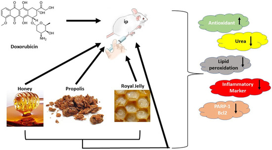 27. Mohamed, E.K.; Osman, A.A.; Moghazy, A.M.; Rahman, A.; AS, A. Propolis Protective Effects Against Doxorubicin-Induced Multi-Organ Toxicity via Suppression of Oxidative Stress, Inflammation, Apoptosis, and Histopathological Alterations in Female Albino Rats. Biointerface Res. Appl. Chem. 2021, 12, 1762–1777. [Google Scholar]