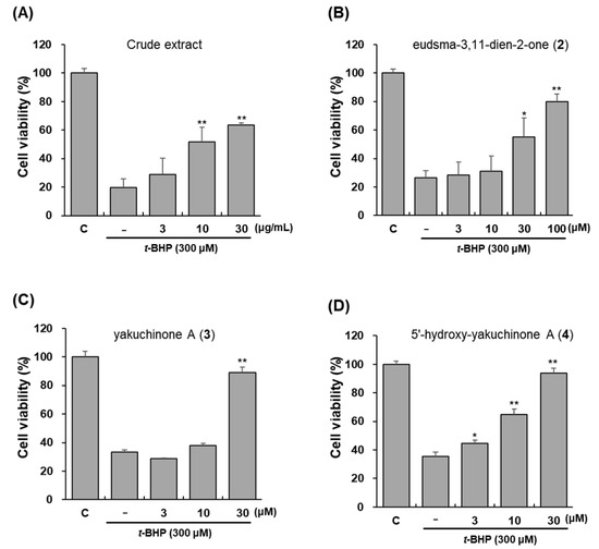 Protection against t-BHP-induced toxicity of total extract (A) and pure compounds 2–4 (B–D) from A. oxyphylla. HepG2-ARE cells were pre-treated with each compound (3, 10, 30, or 100 µM) for 12 h and added t-BHP (300 µM) for 4 h. Data are presented as the mean ± S.D. (n = 3). * p < 0.05, ** p < 0.01 (compared with the vehicle-treated control).