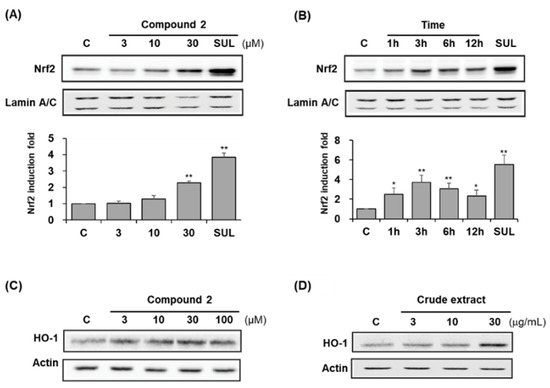 Compound 2 exhibited a protective effect against t-BHP-induced oxidative stress in HepG2 cells but did not scavenge free radicals in ABTS and DPPH assays. The compound 2 enhanced ARE-driven luciferase activity was described earlier. The nuclear translocation of Nrf2 was determined to confirm its ability to activate Nrf2. Treatment of compound 2 (30 μM) caused a 2-fold nuclear Nrf2 accumulation after 12 h exposure at a concentration of 30 μM (Figure 7A). The treatment of compound 2 at 30 μM increased nuclear Nrf2 levels 2.3-fold, and 5 μM sulforaphane enhanced levels 3.9-fold. Then 30 μM of compound 2 was treated, and as a result of checking the change in the level of Nrf2 protein expression with time, it was confirmed that the increase was the highest at 3 h after increasing from 1 h, and it was maintained until 12 h. Furthermore, the representative Nrf2-controlled antioxidant protein, HO-1, was also increased by compound 2 and crude extract (Figure 7C,D).