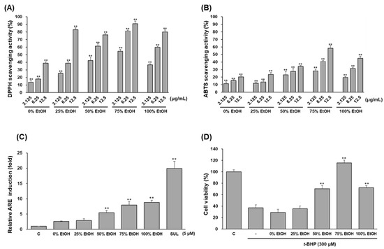Effects of ethanol-water composition on the DPPH (A), ABTS (B) radical scavenging, ARE-luciferase induction (C), and HepG2 cell protective (D) activity. Data are presented as the mean ± S.D. (n = 3). ** p < 0.01 (compared with the vehicle-treated control).