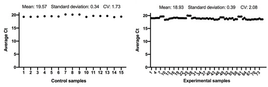 The average ΔCt value of housekeeping gene RNA was subtracted from the average Ct value of the control and experimental groups, yielding the Ct value. The ΔΔCt value was obtained by subtracting the control group’s ΔCt value from the experimental groups’ ΔCt value [32]. The ratio 2−ΔΔCt was used to determine the fold of enrichment values.