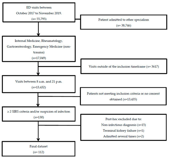 We conducted a prospective cohort study with a follow-up of two years. Adult non-trauma patients (>18–85 years of age) who presented at the emergency department (ED) of the University Medical Center Groningen (UMCG) with a suspected infection (as determined by the treating physician upon initial contact based on focal symptoms suggestive of an infection (e.g., productive cough, dyspnoea, dysuria, pollakisuria, abdominal pain, erythema)) and/or fever (≥38 °C, either at home or upon triage at the ED) which presented for internal medicine, rheumatology, or gastroenterology were screened for participation in this study. Next, patients who met two or more systemic inflammatory response syndrome (SIRS) criteria [22] (i.e., sepsis-2) were included. The SIRS criteria consisted of body temperature > 38 °C or <36 °C, heart frequency > 90 beats/min, respiratory rate > 20 breaths/min or PaCO2 < 32 mmHg, and white blood cell count > 12,000 cells/mm3, <4000 cells/mm3 or >10% immature (band) forms [22]. Written informed consent was obtained from all participating patients or given by proxy. The study protocol was approved by the medical ethical committee of the University of Groningen (in Dutch: “Medisch Ethische Toetsingscommissie”, METc, no. 2017/077). Patients were included from October 2017 to November 2019. The last moment of follow-up was November 2021.