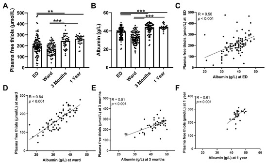 Course of plasma free thiols in patients with sepsis and correlations with albumin. (A) Plasma free thiols at the ED, the ward, and at three months and one year after hospital admission. (B) Albumin levels at the ED, the ward, and at three months and one year after hospital admission. (C) Correlation of plasma albumin at the ED and plasma free thiols at the ED. (D) Correlation of plasma albumin at the ward and plasma free thiols at the ward. (E) Correlation of plasma albumin at three months and plasma free thiols at three months. (F) Correlation of plasma albumin at one year and plasma free thiols at one year. Statistical analyses were performed using Wilcoxon matched-pairs signed test. Bars represent the median; dots represent individual levels. ** means p < 0.01 and, *** p < 0.001. ED: emergency department.