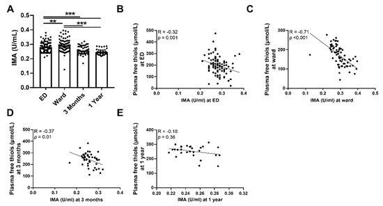 Course of IMA in septic patients and association with plasma free thiols. (A) IMA concentrations at the ED, the ward, and at three months and one year after hospital admission. (B) Correlation of IMA at the ED and plasma free t ian the ED. (C) Correlation of IMA at the ward and plasma free thiols at the ward. (D) Correlation of IMA at three months and plasma free thiols at three months. (E) Correlation of IMA at one year and plasma free thiols at one year. Statistical analyses were performed using Wilcoxon matched-pairs signed test. Bars represent the median; dots represent individual levels. ** means p < 0.01, *** p <0.001. ED: emergency department, IMA: ischemia-modified albumin.