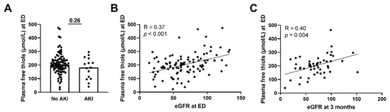 Correlation of plasma free thiols with kidney function. (A) Plasma free thiol levels at the ED in patients with and without AKI. (B) Correlation of plasma free thiols and eGFR at the ED. (C) Correlation of plasma free thiols and eGFR at three months. Statistical analysis in panel A was performed using a Mann–Whitney U test. Bars represent the median; dots represent individual levels. AKI: acute kidney injury ED: emergency department eGFR: estimated glomerular filtration rate.