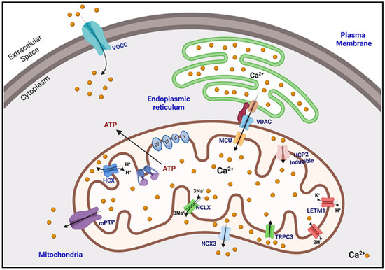 The Ca2+ ions enter the cell through transmembrane proteins or the so-called calcium channels, either voltage-dependent or receptor-operated. Furthermore, specialized calcium transport systems are located in cellular organelles such as mitochondria, nucleus, and Golgi apparatus [121]. For example, mCa2+ uptake is electrogenic, driven by the voltage present in the inner mitochondrial membrane product of the proton pumping performed by the respiratory chain. This transport can be accomplished in different ways, either through the mPTP, MCU, or NCLX [121]. In mitochondria, Ca2+ homeostasis plays a crucial role in physiology, cellular pathophysiology, and is critical for cell death [37,38].