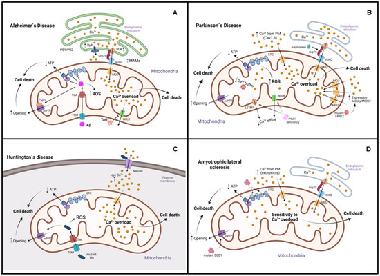 Dysregulation of mCa2+ in neurodegenerative disorders. (A) In Alzheimer’s disease, amyloid-beta aggregates (Aβ) enter mitochondria through the translocases TOM and TIM. Inside, they interact with respiratory chain complexes III, IV, and ATP synthase, leading to ATP synthesis reduction and with CypD, leading to mPTP opening, potential membrane collapse, and cell death activation. Additionally, there is an excessive level of mCa2+ caused by increased IP3Rs and RyR activity dysregulation of voltage-operated channels. Moreover, Tau protein decreases mCa2+ efflux by suppressing NCLX. (B) In Parkinson’s disease, α-synuclein interacts with the chaperone glucose-regulated protein 75 (Grp75), increasing endoplasmic reticulum–mitochondria communication and mCa2+. PTEN-induced kinase 1 (PINK1) deficiency results in mitochondrial calcium overload and ROS production by decreased activity of NCLX and LETM1. (C) In Huntington’s disease, mHtt (mutant huntingtin) enters mitochondria through the translocases TOM and TIM and causes NMDA receptor overactivation in PM, resulting in increased calcium influx and significant mitochondrial depolarization, and ATP synthesis reduction. Additionally, mHtt decreases the Ca2+ threshold necessary to trigger mPTP opening. (D) In amyotrophic lateral sclerosis, SOD1 mutant has an early increase in mCa2+ by endoplasmic reticulum overload and increased cytosolic calcium, which causes loss of mitochondrial membrane potential. In addition, this mutant decreases the activity of respiratory chain complexes I, II, and IV and reduces ATP synthesis. There is an increased mitochondrial susceptibility to Ca2+ overload.