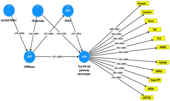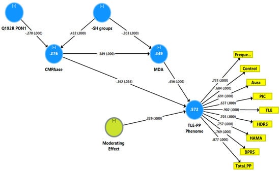 Here, there were no total (that is direct and mediated) effects (t = 1.47, p = 0.142) and no direct effects (pathway coefficient pc = 0.133, p = 0.254) of the Q192R genotype on the TLE-PP phenome, while the Q192R genotype has significant total indirect effects on the TLE-PP phenome (t = 3.21, p = 0.001), which are mediated by CMPAase (t = 2.02, p = 0.043) and the path from CMPAase to MDA (t = 2.67, p = 0.008). Moreover, there were highly significant total effects of -SH groups (t = −5.62, p < 0.001) on the TLE-PP phenome that were mediated by MDA (t = −3.48, p = 0.001) and the path from CMPAase to MDA (t = 3.41, p = 0.001). Moreover, we found a significant interaction (moderating) effect between CMPAase and MDA on the phenome. Overall, the TLE-PP phenome is predicted by CMPAase and MDA and an interaction between CMPAase and MDA, with significant indirect effects of Q192R genotype and -SH groups. As such, there are significant total indirect effects of CMPAase (t = −4.11, p < 0.001) on the TLE-PP phenome.