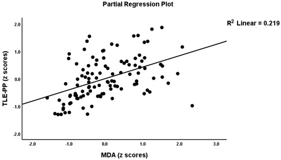 Table 2, model #1 shows that 50.4% of the variance in the TLE-PP score could be explained by the regression on ANTIOX and age (both inversely associated) and OSTOX (positively associated). Figure 2 displays the partial regressions of the TLE-PP score on ANTIOX (after considering the effects of the other variables listed in model #1). In Table 2, Model #2, we entered the single biomarkers and observed that 51.1% of the variance in the TLE-PP score could be explained by the regression on MDA (positively associated), CMPAase, TRAP and NOx (all inversely associated). Figure 3 shows the partial regression of TLE-PP score on MDA (after considering the effects of the variables listed in model #2).