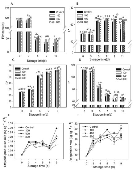 Effects of melatonin applications on fruit physiology. (A) Impact of melatonin treatments on papaya fruit firmness. (B,C) The effect of melatonin treatment on the chromaticity L* (B), C* (C), h° (D) of papaya fruit. (E) The effect of melatonin treatment on ethylene production rate in papaya fruits. (F) The effect of melatonin treatment on the respiration rate in papaya fruits. Each data point indicates the mean standard deviation (n = 3). Different letters denoted substantial changes at the 5% level. To compare significant effects at the 5% level, the least significant differences (LSDs) were determined. “100”, “400” and “800” indicated the “100 μmolL−1”, “400 μmolL−1” and “800 μmolL−1” melatonin treatments.
