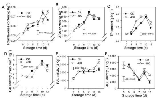 Effects of melatonin application on lignin biosynthesis enzymes activity and other defense-related substances in papaya fruit. (A) Effect of melatonin application on total flavones (B) ASA (C) TP (D), C4H (E) PAL (F) 4CL activity. The experiments were carried out in triplicate and each data point shows the mean ± SE (n = 3). To compare significant effects at the 5% level, least significant differences (LSDs) were determined. CK: control group, “400” indicated the “400 μmolL−1” melatonin treatments.