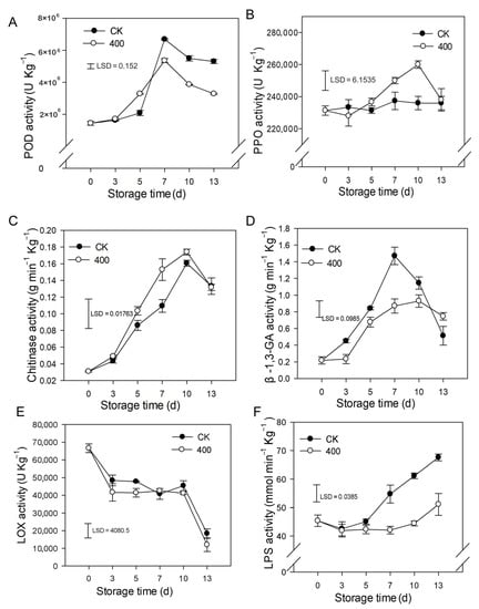 Impact of melatonin applications on phenolic, lipid metabolism, and other defense-related-enzymes activities in papaya fruit. (A) Effect of melatonin treatment on POD (B) PPO (C) CHI (D) β-1,3-GA (E) LOX and (F) LPS activity. Each data point indicates the mean SE (n = 3), and LSD was computed to compare significant effects at the 5% level. CK: control group, “400” indicated the “400 μmolL−1” melatonin treatments.