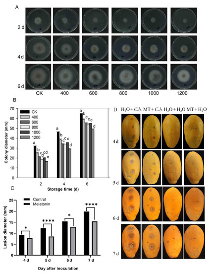 Effect of melatonin application on the development of C. brevisporum in vitro and in vivo. (A) Colony morphology of C. brevisporum on PDA medium with different concentrations of melatonin. (B) The effect of melatonin treatment on colony diameter (C) and lesion diameter of anthracnose. (D) Disease symptoms on papaya fruit after inoculation for 4, 5, 6 and 7 days. Each data point denotes the mean ± SE (n = 3). Different letters show substantial differences at the 5% level. * and **** indicated a significant difference at 0.05 and 0.001 levels, respectively. CK: control group, “400”, “600”, “800” “1000”, and “1200”, indicated the “400 μmolL−1”, “600 μmolL−1”, “800 μmolL−1”, “1000 μmolL−1” and “1200 μmolL−1” melatonin treatments. MT: 400 μmolL−1 melatonin treatment, C.b.: Colletotrichum brevisporum.