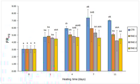For CTR, RAE-1, and RAE-2 batches, a progressive fluorescent compound formation (p < 0.05) in the lipid extract of the fish muscle (FRorg) was detected for the 0–7-day period, which was followed by a decrease of the average value at the end of the experiment (Figure 1). For samples corresponding to the RAE-3 batch, an average value increase was detected for the 0–4-day period, followed by a decrease till day 11. A comparison of the samples revealed an inhibitory effect (p < 0.05) of flour extract presence on the formation of these deteriorative compounds in the 4–11-day heating time. During this period, the highest average values were detected in the control batch; differences with treated-muscle batches were found to be significant (p < 0.05) on day 4 (RAE-1 batch), day 7 (RAE-2 and RAE-3 batches), and day 11 (all flour-containing batches).