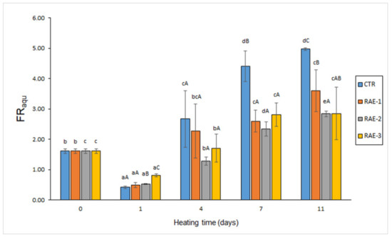 The evolution of fluorescent compound content in the lipid extract of fish muscle (FRorg) heated in the presence of red alga extract (RAE). Abbreviations of RAE concentrations are as expressed in Table 1. Mean values of three independent determinations (n = 3); standard deviations are shown by bars. Mean values accompanied by lowercase (a–d) letters denote significant differences (p < 0.05) as a result of heating time; mean values accompanied by capital letters (A,B) denote significant differences (p < 0.05) as a result of RAE concentration.