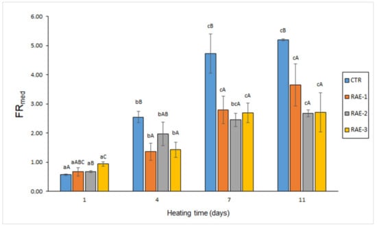 The evolution of fluorescent compound content in the liquid medium (FRmed) resulting from fish muscle heating in the presence of red alga extract (RAE). Abbreviations of RAE concentrations as expressed in Table 1. Mean values of three independent determinations (n = 3); standard deviations are shown by bars. Mean values accompanied by lowercase (a–c) letters denote significant differences (p < 0.05) as a result of heating time; mean values accompanied by capital letters (A–C) denote significant differences (p < 0.05) as a result of RAE concentration.
