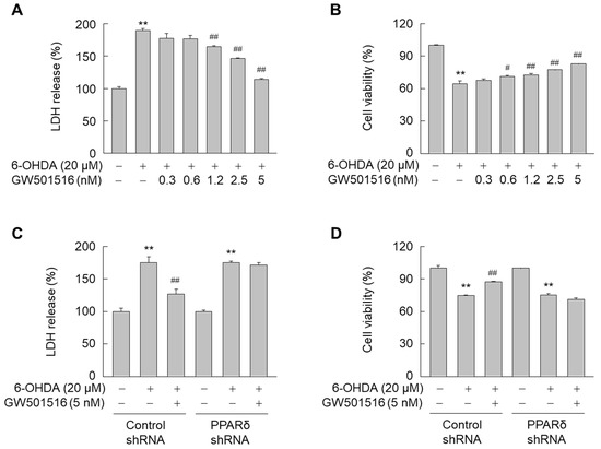 Subsequently, we evaluated the effects of GW501516, a PPARδ-specific agonist against 6-OHDA neurotoxicity. When SH-SY5Y cells were treated with 6-OHDA for 24 h, LDH release was significantly increased. However, 6-OHDA-induced LDH release was dose-dependently decreased by GW501516 treatment (Figure 1A). Similarly, 6-OHDA-induced decrease in cell viability (MTT assay) was also reversed by GW501516 in a concentration-dependent manner (Figure 1B).