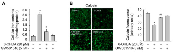 Iron accumulation in dopaminergic neurons has been implicated in the pathogenesis of PD [15,16]. Moreover, 6-OHDA-induced reduction in viability is attenuated by ferroptosis inhibitors such as ferrostatin-1 and liproxstatin-1 (Supplementary Figure S3). Thus, we determined if the neuroprotective role of PPARδ in 6-OHDA-induced neurotoxicity was associated with the regulation of intracellular iron. When SH-SY5Y cells were exposed to 6-OHDA for 24 h, intracellular iron levels were markedly increased. However, 6-OHDA-induced iron accumulation was significantly decreased by GW501516 (Figure 2A,B).