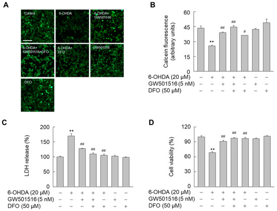 3.2. GW501516 Activation of PPARδ Decreases 6-OHDA-Induced Iron Accumulation
