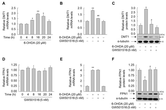 GW501516 activation of PPARδ regulates 6-OHDA-triggered expression of level of DMT1 and FPN1 protein, and DMT1 mRNA, but not FPN1 mRNA. (A) Cells were treated with 6-OHDA for the indicated durations. (B,C) Cells pretreated with DMSO or GW501516 for 8 h were incubated with or without 6-ODHA for 16 h. (D) Cells were treated with GW501516 for the indicated durations. (E,F) Cells pretreated with DMSO or GW501516 for 8 h were incubated with or without 6-ODHA for 16 h. Total RNA and protein were extracted, and mRNA and protein levels were analyzed by real-time PCR (A,B,D,E) and Western blot (C,F), respectively. RPS18 and α-tubulin were used as internal controls for real-time PCR and Western blot, respectively. Results are expressed as means ± SE (n = 3). An image analyzer was used to quantify band intensity of Western blot, and the ratio of protein to α-tubulin is indicated above each lane. * p < 0.05, ** p < 0.01 relative to the untreated group; # p < 0.05, ## p < 0.01 relative to the 6-OHDA-treated group.