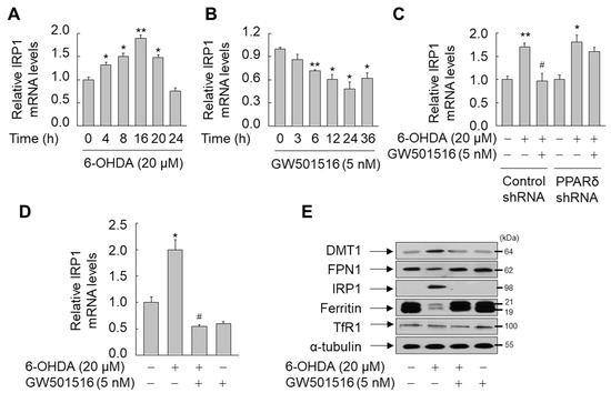 To further elucidate the molecular mechanism of PPARδ-mediated modulation of key iron-regulatory proteins in SH-SY5Y cells, we determined the effect of GW501516 on the expression of IRP1, which is known to regulate the expression of these key proteins by binding IREs in the 3′ or 5′ UTRs of these genes [38]. When SH-SY5Y cells were exposed to 6-OHDA, IRP1 mRNA was increased, reaching a maximum of two-fold upregulation after 16 h and declining to basal levels after 24 h (Figure 6A). Contrastingly, GW501516 monotreatment downregulated IRP1 mRNA in a time-dependent manner (Figure 6B). Consistent with these results, shRNA-targeted knockdown of PPARδ suppressed the effects of GW501516 on 6-OHDA-induced IRP1 upregulation (Figure 6C). Consistently, the pre-treatment with GW501516 attenuated 6-OHDA-induced upregulation of IRP1 mRNA (Figure 6D). This PPARδ-mediated downregulation of IRP1 was correlated with expression of target proteins, in which GW501516 markedly reversed the effects of 6-OHDA on the protein expression of DMT1, FPN1, and ferritin, but not TfR1 (Figure 6E). In contrast, GW501516 did not alter markedly the mRNA and protein expression of IRP2 (Supplementary Figure S4), which has high sequence homology and similar biochemical activities to that of IRP1 [39]. This result may explain the effect of GW501516 on the expression of TfR1, which is more affected by IRP2 than IRP1 [40]. Additionally, GPX4 or FSP1, important effectors in anti-ferroptotic signaling [41,42], were not regulated in presence of GW501516 (Supplementary Figure S5).
