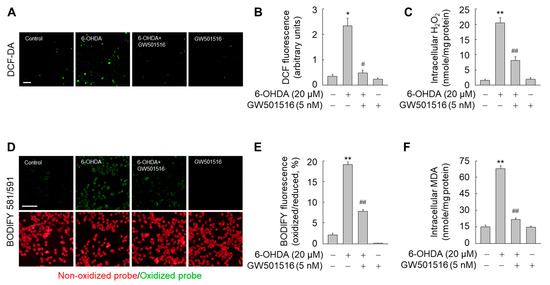 3.4. GW501516 Activation of PPARδ Decreases 6-OHDA-Triggered Accumulation of ROS and Lipid Peroxides