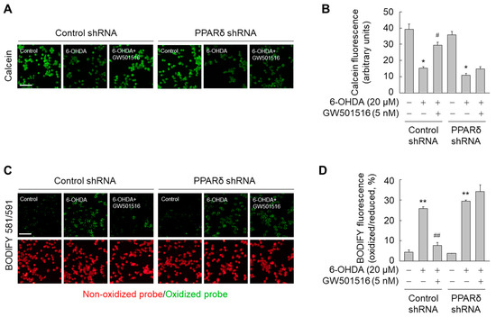 PPARδ knockdown abrogates the effects of GW501516 on intracellular iron accumulation and lipid peroxidation in SH-SY5Y cells. (A,C) Cells stably expressing shRNA targeting scrambled sequences or PPARδ were pretreated with DMSO or GW501516 for 8 h, and subsequently incubated with or without 6-OHDA for 24 h. Cells were then incubated in medium containing calcein-AM (A) or C11-BODIPY 581/591 (C) to detect intracellular iron and lipid peroxides, respectively. (B,D) Fluorescence signals corresponding to intracellular iron (B) and oxidized C11-BODIPY (B) were detected using fluorescence microscopy and fluorescence intensities were quantified. Results are expressed as means ± SE (n = 3). Scale bar, 100 μm. * p < 0.05, ** p < 0.01 relative to untreated group; # p < 0.05, ## p < 0.01 relative to 6-OHDA-treated group.