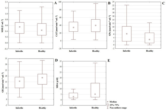 Activity of superoxide dismutase SOD (A), catalase CAT (B), glutathione peroxidase GPx (C), and glutathione reductase GR (D); concentration of malondialdehyde MDA (E) in healthy controls and men with fertility disorders.