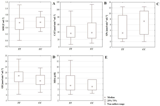 Activity of superoxide dismutase SOD (A), catalase CAT (B), glutathione peroxidase GPx (C), and glutathione reductase GR (D); concentration of malondialdehyde MDA (E) regarding IL-4v.C589T (rs2243250) genotypes CC and TT.